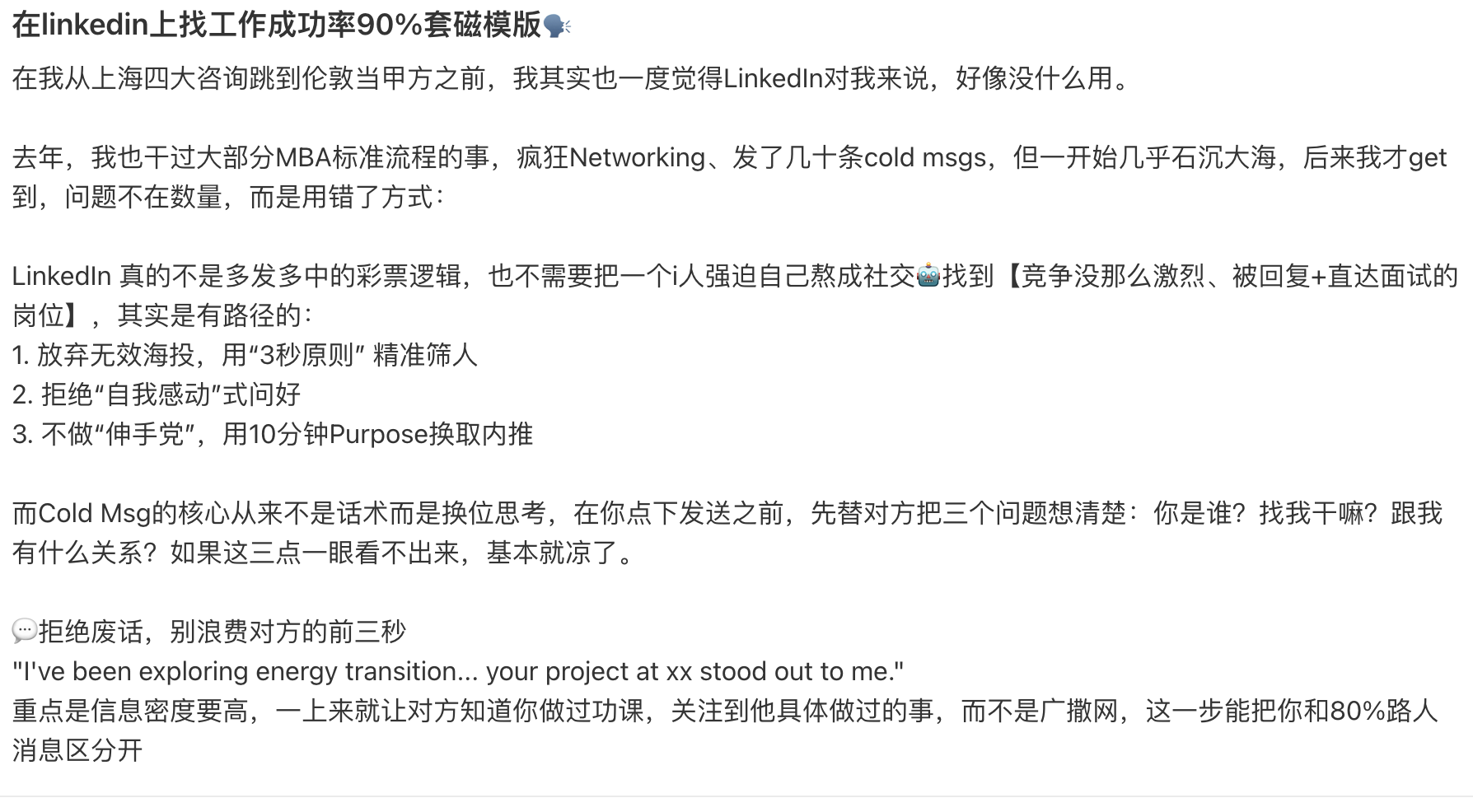 重点是信息密度要高,一上来就让对方知道你做过功课,关注到他具体做过的事,而不是广撒网,这一步能把你和80%路人消息区分开