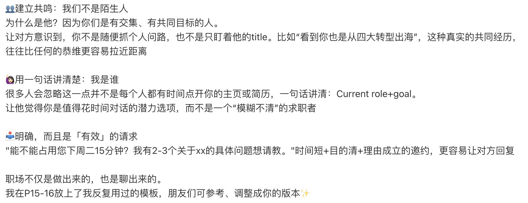 让他觉得你是值得花时间对话的潜力选项,而不是一个“模糊不清”的求职者