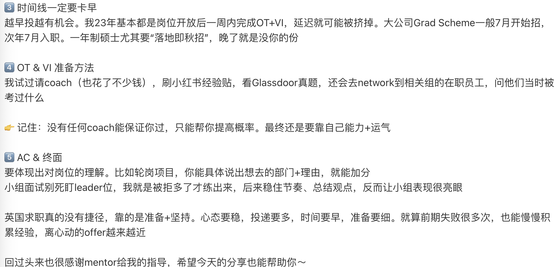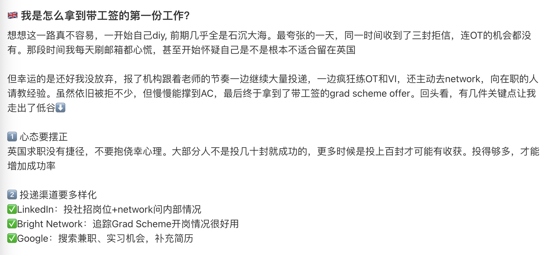 但幸运的是还好我没放弃,报了机构跟着老师的节奏一边继续大量投递,一边疯狂练OT和VI,还主动去network,向在职的人请教经验。虽然依旧被拒不少,但慢慢能撑到AC,最后终于拿到了带工签的grad scheme offer。回头看,有几件关键点让我走出了低谷⬇️