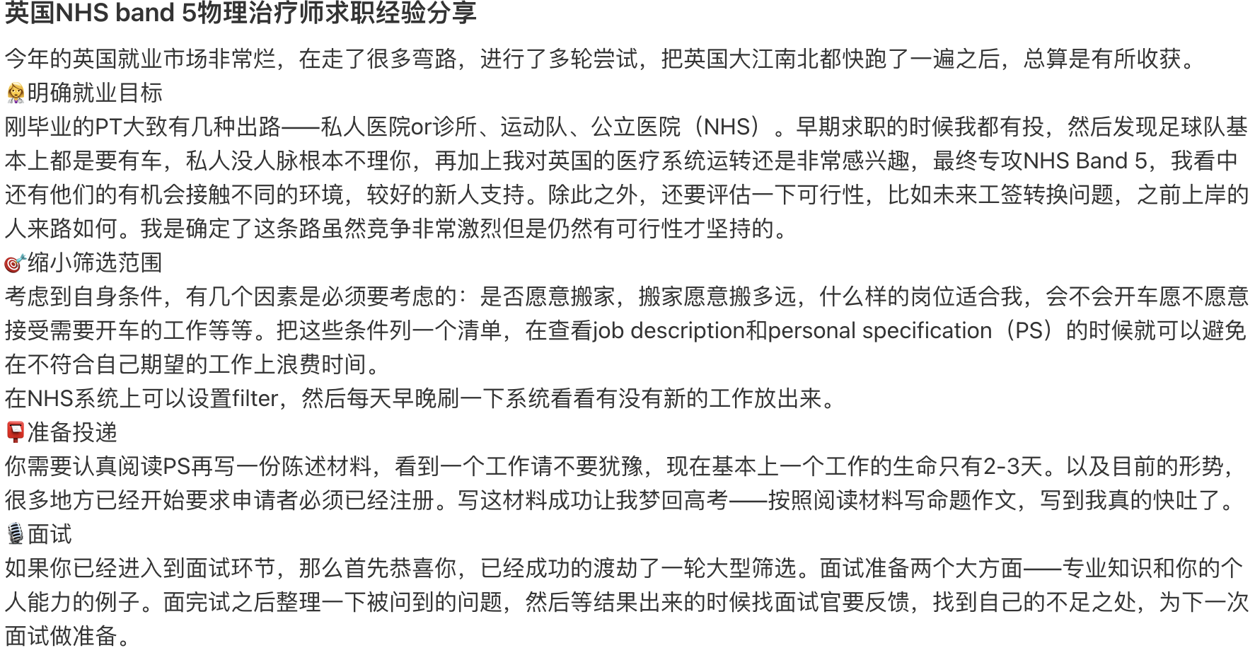 刚毕业的PT大致有几种出路——私人医院or诊所、运动队、公立医院(NHS)。早期求职的时候我都有投,然后发现足球队基本上都是要有车,私人没人脉根本不理你,再加上我对英国的医疗系统运转还是非常感兴趣,最终专攻NHS Band 5,我看中还有他们的有机会接触不同的环境,较好的新人支持。除此之外,还要评估一下可行性,比如未来工签转换问题,之前上岸的人来路如何。我是确定了这条路虽然竞争非常激烈但是仍然有可行性才坚持的。