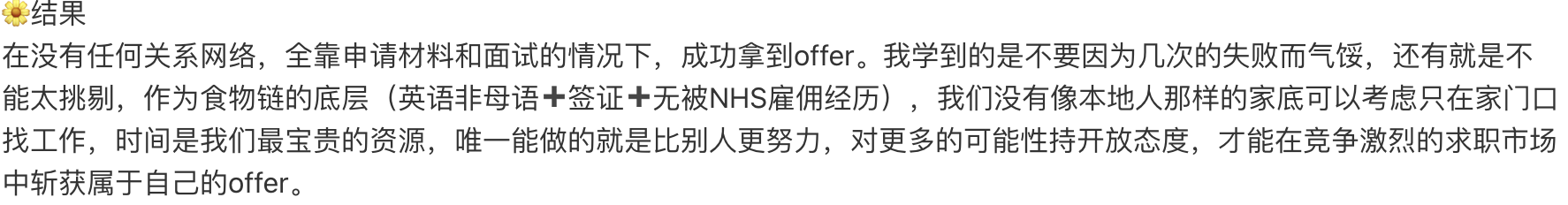 在没有任何关系网络,全靠申请材料和面试的情况下,成功拿到offer。我学到的是不要因为几次的失败而气馁,还有就是不能太挑剔,作为食物链的底层(英语非母语➕签证➕无被NHS雇佣经历),我们没有像本地人那样的家底可以考虑只在家门口找工作,时间是我们最宝贵的资源,唯一能做的就是比别人更努力,对更多的可能性持开放态度,才能在竞争激烈的求职市场中斩获属于自己的offer。