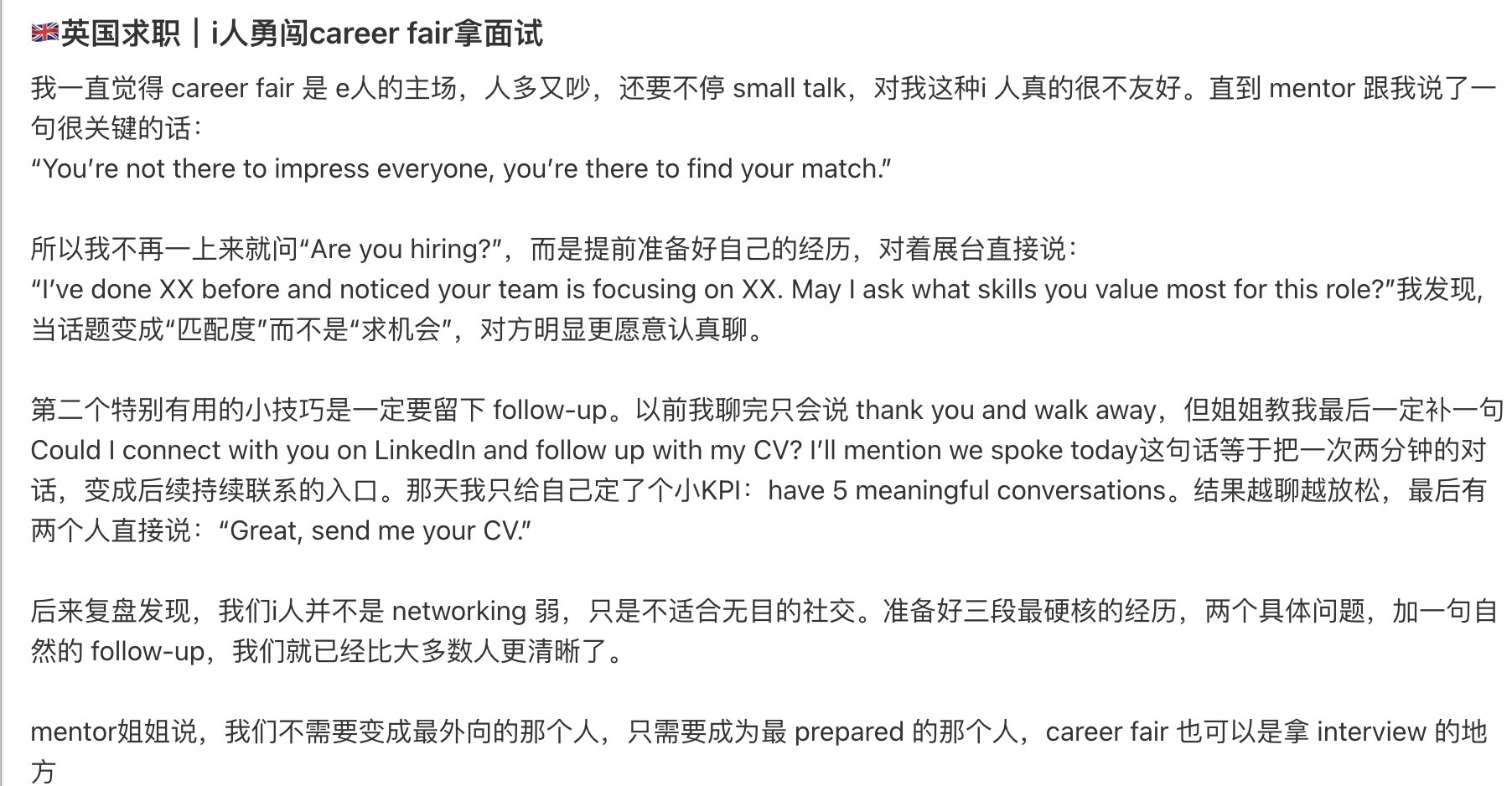 第二个特别有用的小技巧是一定要留下 follow-up。以前我聊完只会说 thank you and walk away,但姐姐教我最后一定补一句Could I connect with you on LinkedIn and follow up with my CV? I’ll mention we spoke today这句话等于把一次两分钟的对话,变成后续持续联系的入口。那天我只给自己定了个小KPI:have 5 meaningful conversations。结果越聊越放松,最后有两个人直接说:“Great, send me your CV.”