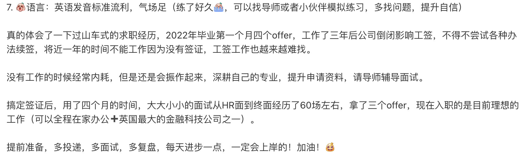 搞定签证后,用了四个月的时间,大大小小的面试从HR面到终面经历了60场左右,拿了三个offer,现在入职的是目前理想的工作(可以全程在家办公➕英国最大的金融科技公司之一)。