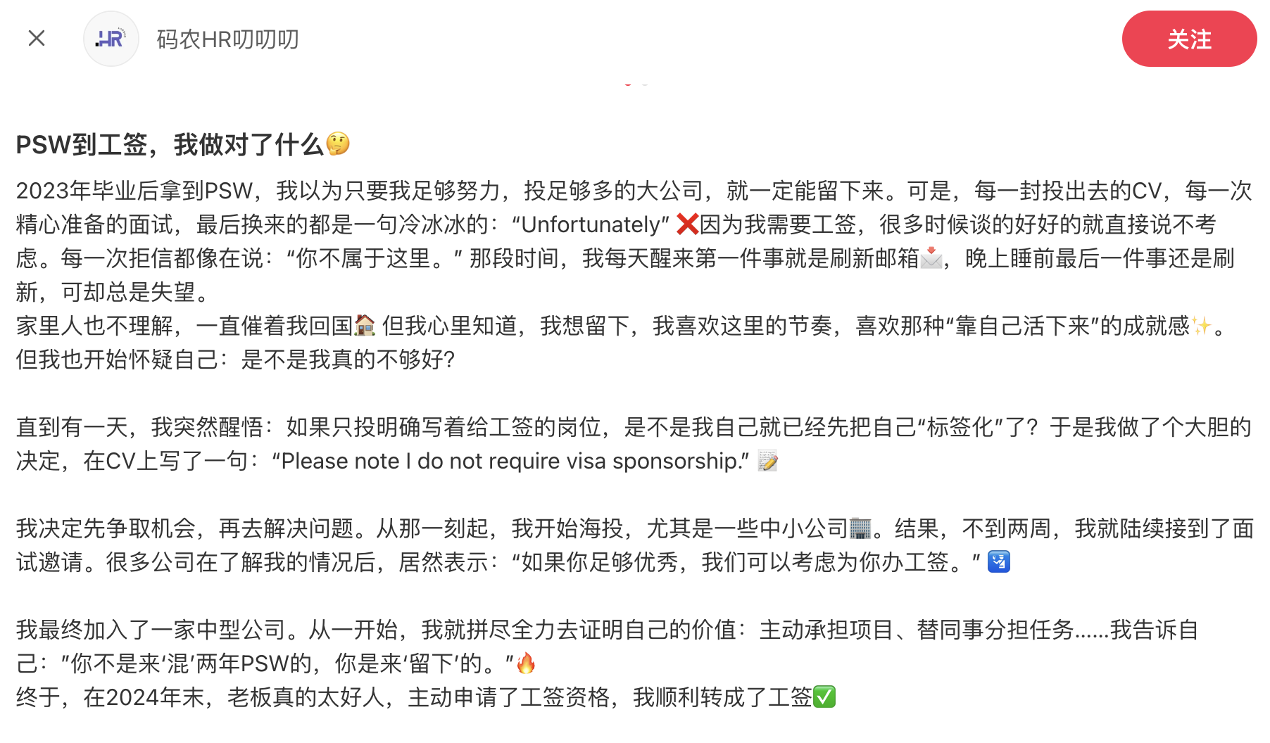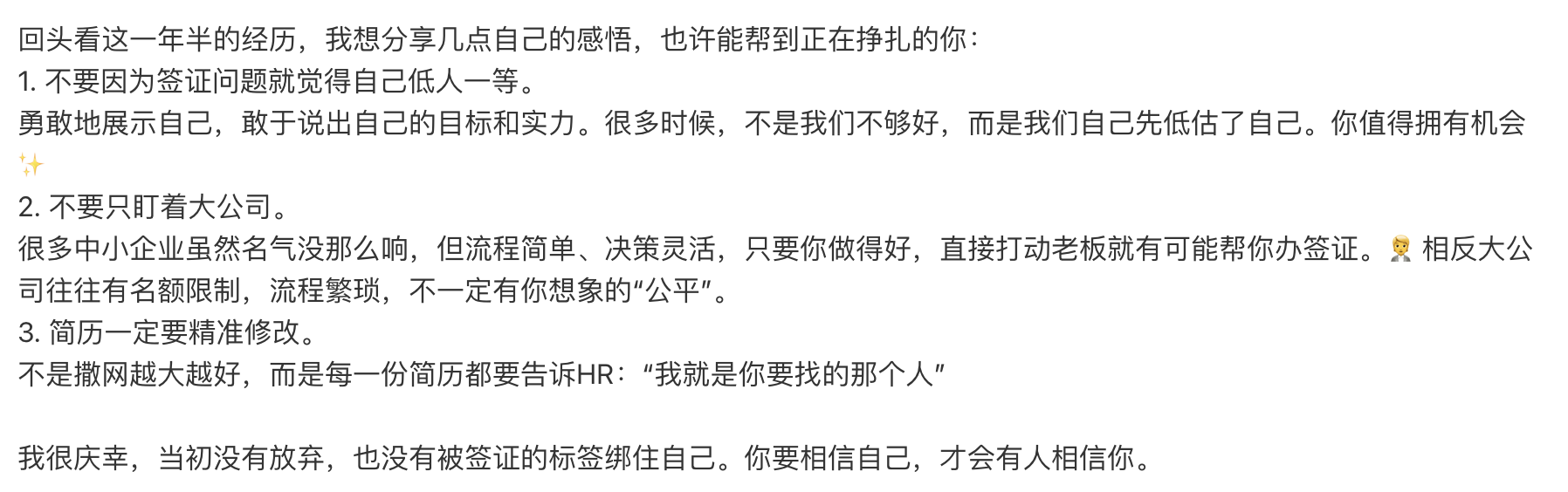 直到有一天,我突然醒悟:如果只投明确写着给工签的岗位,是不是我自己就已经先把自己“标签化”了?于是我做了个大胆的决定,在CV上写了一句:“Please note I do not require visa sponsorship.” 📝