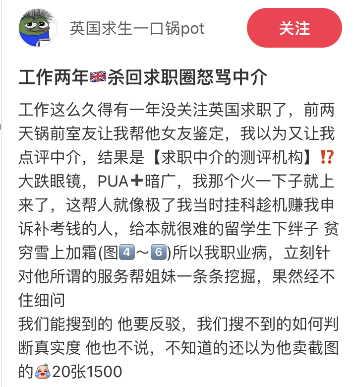 今天我在小红书上刷到一条帖子,博主的标题大意是:“工作两年回到英国求职圈,看到一种新东西——‘求职中介的测评机构’,气到想骂人。”
