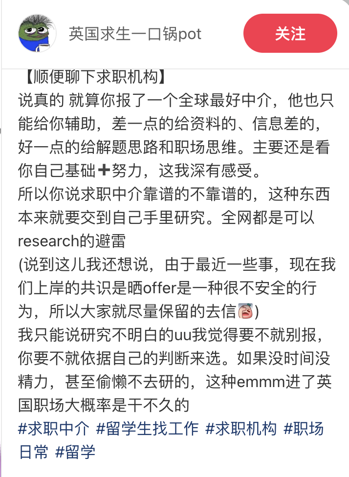 博主说,他/她已经有一段时间没关注英国求职市场了。最近朋友请他/她帮忙“鉴定”,原本以为是在看某家求职中介,结果发现对方接触的是一种更“上层”的服务:专门做“求职中介测评/中介推荐”的机构(也可以理解为“中介的中介”)。